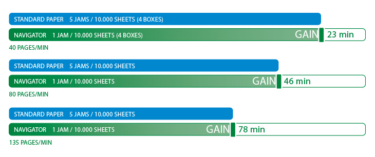 Navigator的認證性能意味著每10,000張紙就會堵塞一次,而不是5張其他辦公用紙。考慮到卡紙可能需要3分鐘才能解決,這取決於所使用的打印設備或複印機的類型,這可以轉化為生產率的潛在增益。